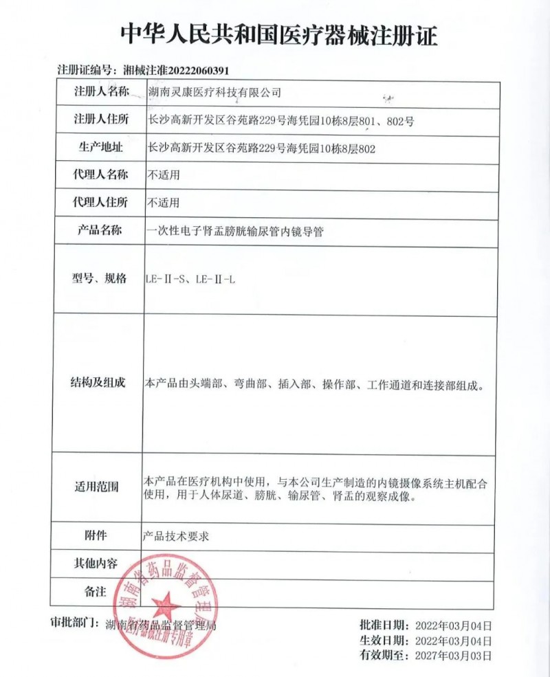 2022年3月4公司自主研发的一次性电子肾盂膀胱尿道内镜导管通过湖南省药品监督管理局审查,已被获批上市!