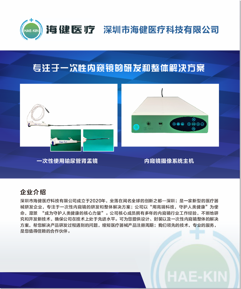 深圳市海健医疗科技有限公司成立于 2020 年,是一家新型的医疗器械研发企业,专注于一次性内窥镜的研 发和整体解决方案; 可为您提供设计、封装以及一次 性内窥镜整体的解决方案,帮您解决产品研发过程遇到的问题,缩短医疗 器械产品注册周期;
