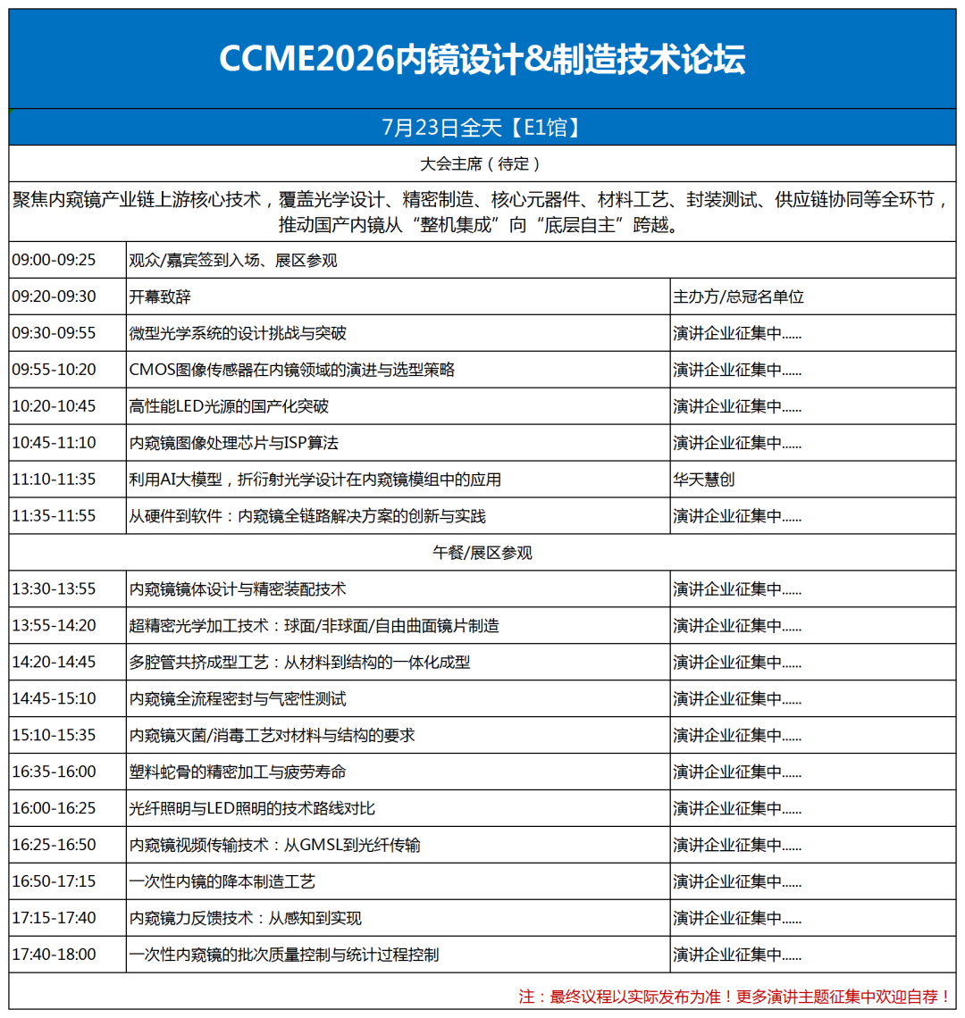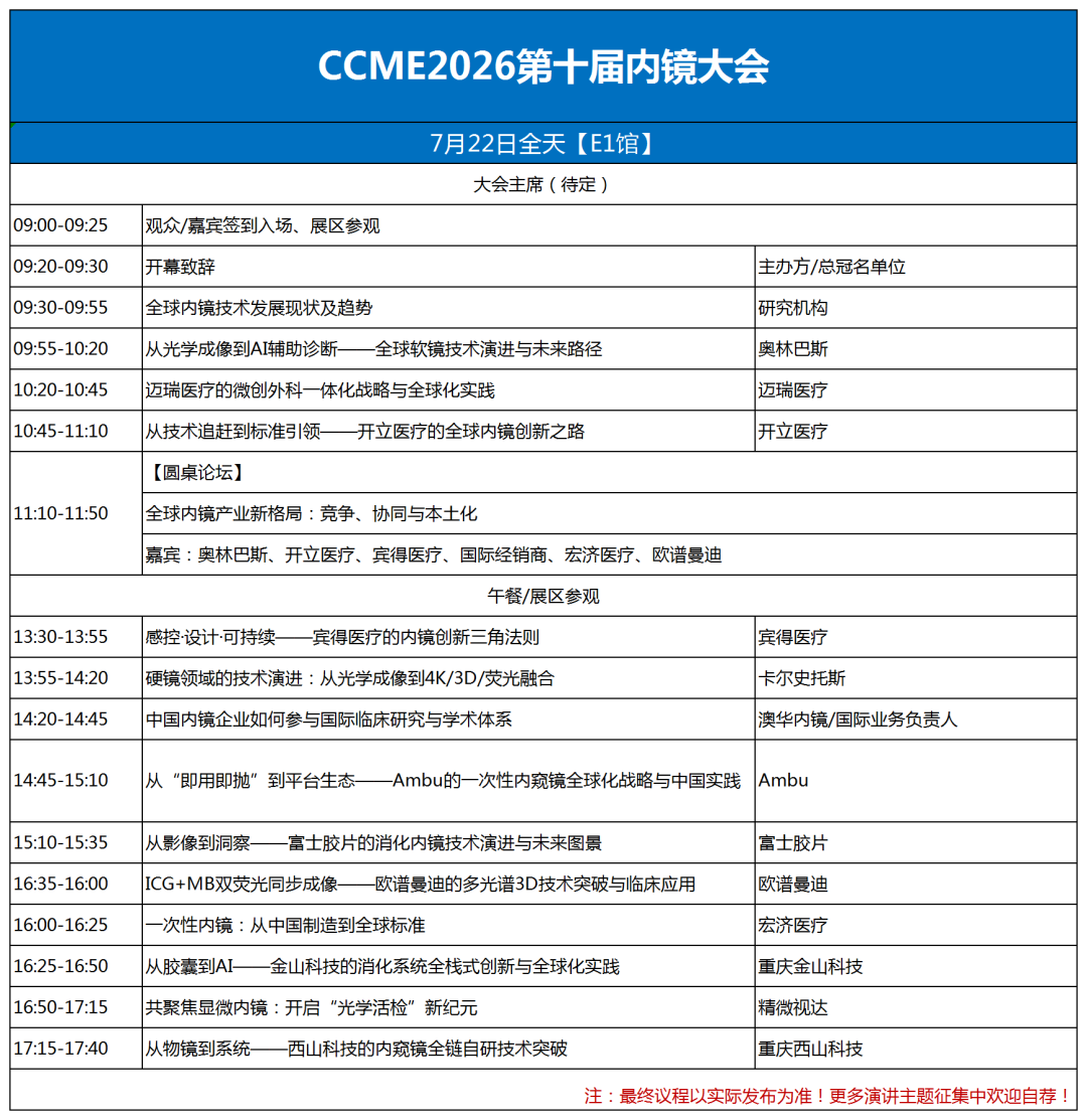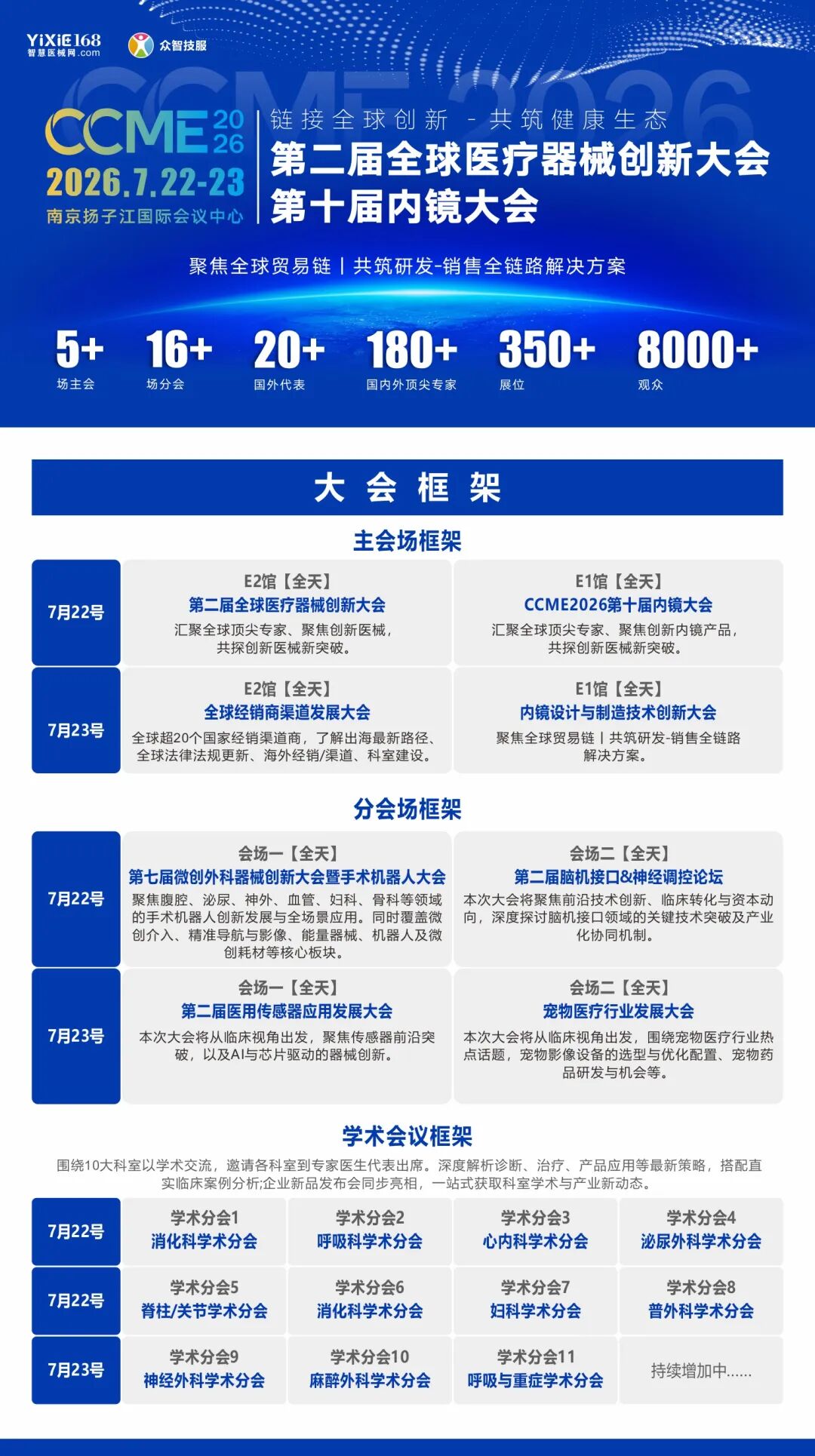备受行业瞩目的“CCME2026全球医疗器械创新大会暨第十届内镜大会”即将启航。本届大会以加速国产医疗器械“全球化”进程、树立“产、学、研”产业高地为宗旨,至今已成功举办九届,曾在深圳、上海、无锡、杭州、南京等地召开。大会通过整合供应链、加强行业交流、推动关键技术攻关,有效促进了国产医疗内镜及高端医械的国产化发展。