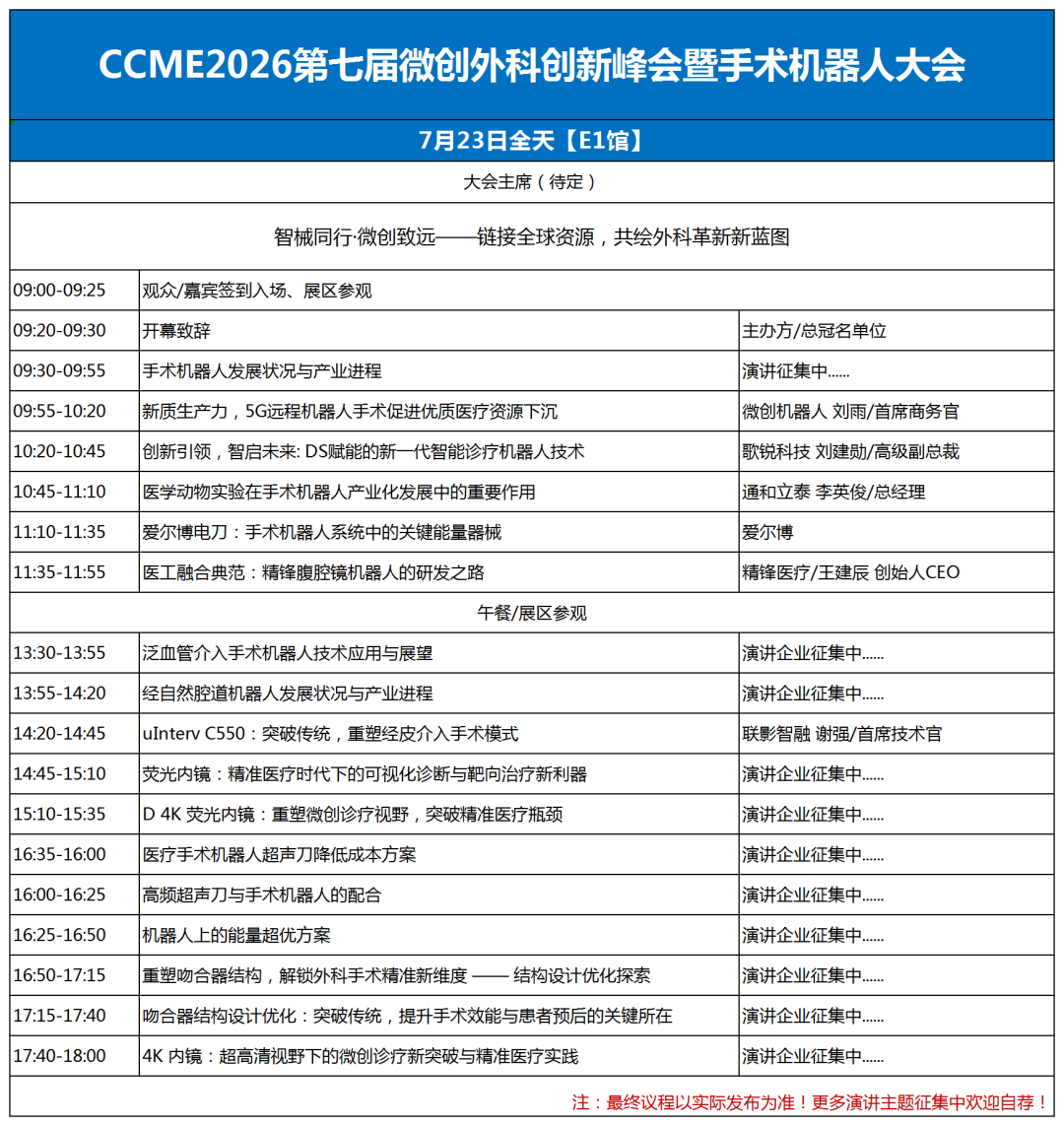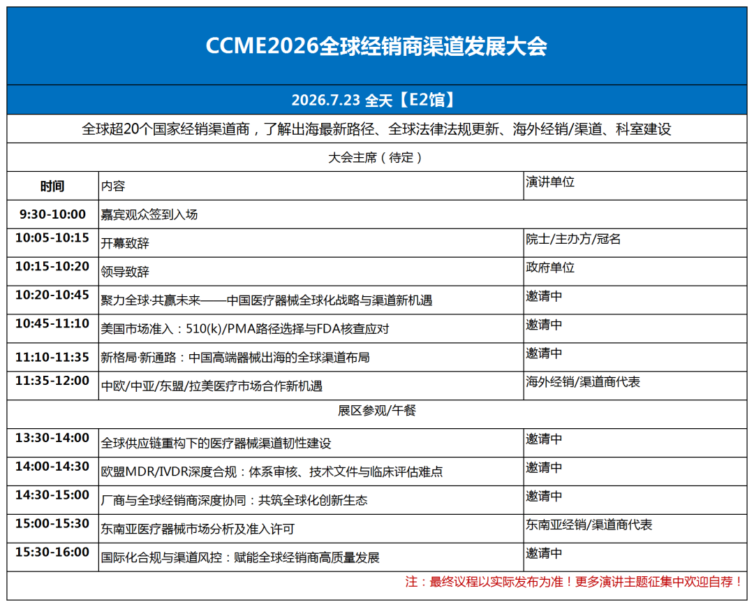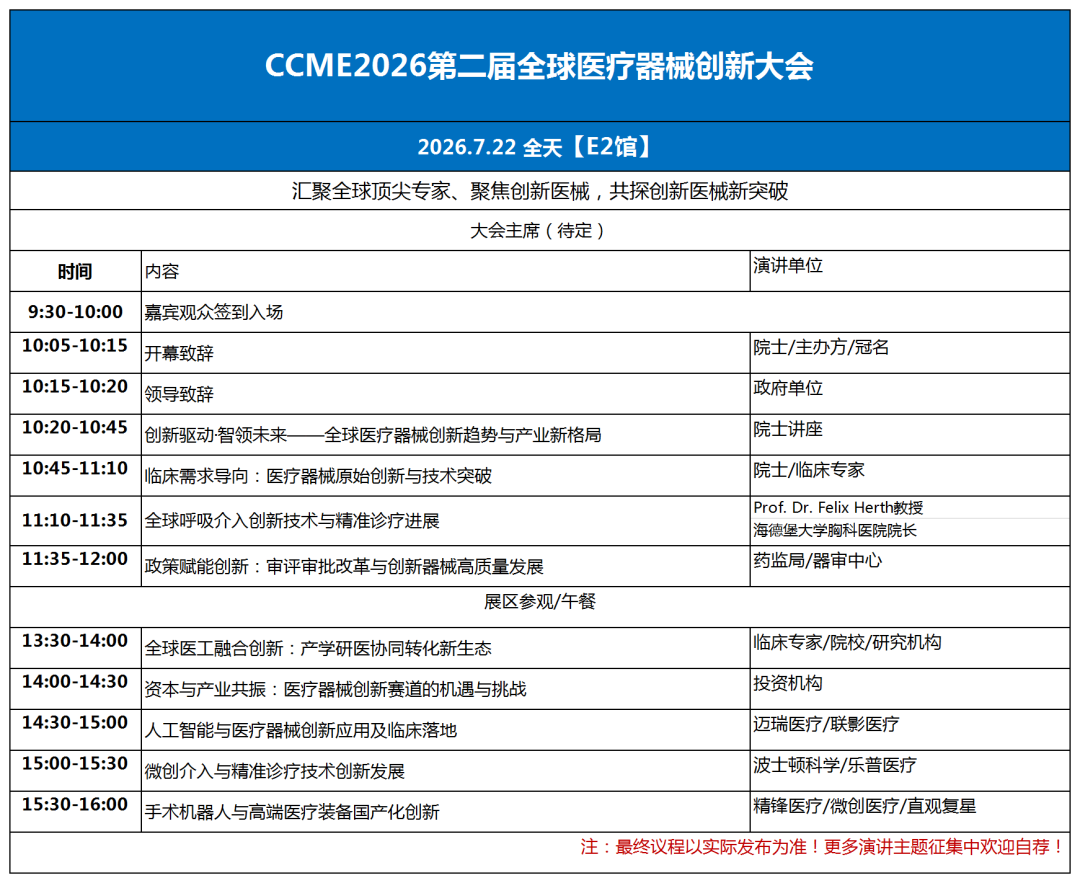 同期还将举办全球经销商渠道发展大会、内窥镜设计&制造大会、第七届手术机器人大会、第二届医用传感器技术交流会、第二届脑机接口&神经调控论坛及十余场学术与临床专场会议。届时,大会将汇聚来自10余个科室的全球顶尖医学专家、超20个国家的经销商代表团、200家国内医院专家、350家创新器械展商,预计参会人数达8000余人,内容涵盖海外市场拓展、学术与临床应用、产品创新、科室建设及供应链合作等多个方向,诚邀全产业链同仁共襄盛会。