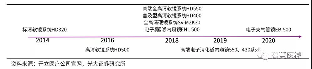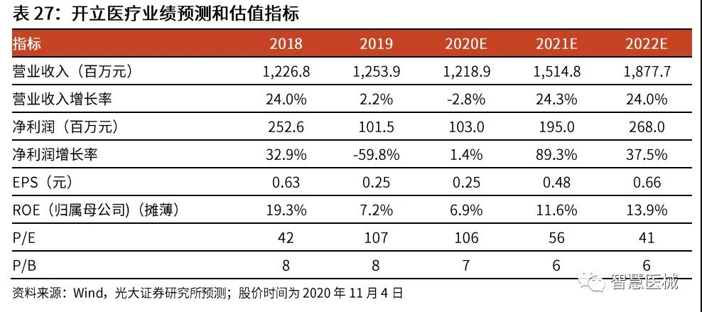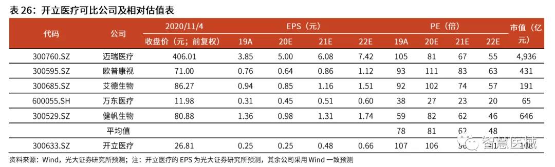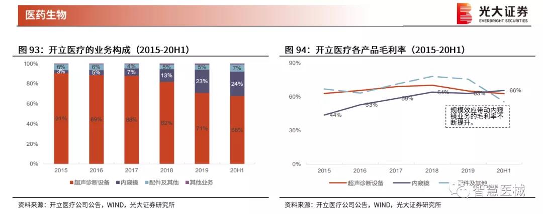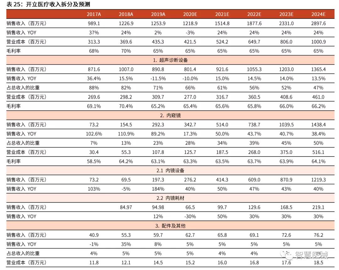收购威尔逊医疗,补齐内镜器材产品线。2018年10月,开立医疗以3.88亿元收购上海威尔逊与和一医疗100%的股权,交易对价为3.88亿元。威尔逊主要研发生产活检钳、圈套器、异物钳和网篮等内镜治疗器具和超声波清洗机、清洗刷等内镜清洗消毒设备。和一医疗是同一控制人下的销售公司。我们认为,内镜诊疗器材和公司原有的内镜产品协同作用明显,公司拓展该领域一方面丰富了内镜配套产品的种类,为公司增加了新的业绩增长点,并带动公司内镜产品从诊断到诊治方向的转变;另一方面,内镜和治疗器具的结合有利于满足专科科室的整体需求,从而促进内镜产品在科室的推广和销售。受新冠疫情影响,2020年上半年威尔逊的镜下耗材业务影响较大,相关的商誉可能计提减值。 销售∶加大销售投入并改革营销体系,渠道短板正在补齐。公司不断加大销售方面的投入,销售费用从2015年的1.8亿元提升至2019年的4.1亿元(2020年受疫情影响,公司采取控费措施,销售费用有所下降)。(1)国内方面,公司自2019年 10月以来,实施营销体系改革,由原来的办事处主任单一角色决策转变为产品线、民营医疗体系、公立医疗体系、办事处等多体系人员集体决策,决策更为科学合理,同时对销售人员的考核也更加全面,重点增加了对销售人员发展有效代理商的考核。我们认为经过此次营销改革,公司的产品销售将更具稳定性和持久性,老产品的生命周期更长。(2)海外方面,公司积极推进海外建办,新设立多家子公司及分支机构,并招聘海外当地营销人员,挖掘日系品牌原有的渠道商,直接对接终端医疗机构,公司的品牌影响力和渠道管控能力有望提升。同时,公司目前已经在国内建立了近 20家国产内镜示范基地,并召开多次学术交流活动邀请行业专家使用公司内镜产品进行现场指导手术,大大提升了公司产品的知名度。我们认为,公司的销售短板正在逐渐补齐,内镜产品的早期布局进展顺利。 关键假设∶ 1)超声诊断设备∶考虑到疫情对公司 2020年超声业务具有较大负面影响,且在 2020年低基数基础上,2021年的同比增速将提升,我们预计该业务 20-24年收入同比增长-10.0%/15.0%/14.5%/14.0%/13.5%。毛利率从2019年的65.2%提升至 2024E 的 66.2%。 2)内窥镜∶ 考虑到公司内镜设备正处在放量阶段,疫情对其影响较小,我们预计内镜设备 20-24年收入同比增长40%/50%/47%/43%/40%;考虑到疫情期间医院门诊量的下滑以及内镜诊疗量的逐季改善,我们预计内镜耗材20-24年收入同比增长-30%/50%/30%/30%/30%。毛利率从2019年的63.1%提升至2024E的64.1%。 3)配件及其他∶我们预计20-24年收入维持5%的增速,预测期毛利率与2019年保持一致。 4)其他业务∶我们预计 20-24年收入维持10%的增速,预测期毛利率与2019年保持一致。 盈利预测、估值与评级 公司是中国领先的医疗器械公司,其超声和内窥镜产品均做到国产前二的份额水平,且内窥镜进口替代空间巨大,公司的内镜未来放量空间巨大。我们预测公司 20-22年 EPS为0.25/0.48/0.66元,分别同比增长1%/89%/37%,现价对应20-22年 PE 为 106/56/41。 我们选择A股其他医疗器械公司迈瑞医疗/欧普康视/艾德生物/万东医疗/健帆生物作为可比公司。可比公司当前股价对应2020年 PE均值为 81倍,公司当前股价对应 2020年 PE为 106 倍,主要由于公司超声业务受疫情影响带来的净利润下滑。 考虑到公司是国产内镜设备龙头,中长期放量空间巨大,且疫情影响正在逐渐消除,我们看好公司的中长期发展节奏,首次覆盖,给予''买入''评级。 风险提示∶内镜设备放量速度不及预期;超声和内镜耗材销售恢复不及预期。