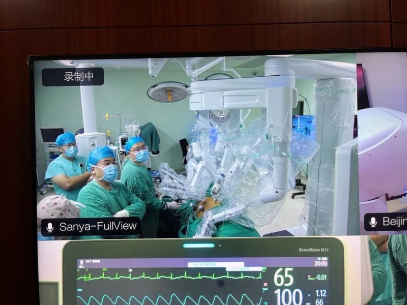 本次手术对象为一名左肾肿瘤患者,经医生团队论证和患者及家属知情同意,决定行远程精锋®机器人辅助腹腔镜左肾根治性切除术。由解放军总医院泌尿外科专家李宏召教授在北京主刀,高宇教授、董毅医生在三亚台上配合,同时史涛坪教授和刘启明教授在三亚手术室做技术保障。