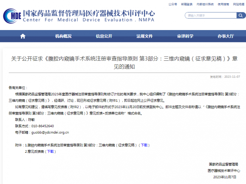 通知表示,“根据国家药品监督管理局2023年度医疗器械注册审查指导原则制修订计划的有关要求,中心组织编制了《腹腔内窥镜手术系统注册审查指导原则第3部分:三维内窥镜(征求意见稿)》,经调研、讨论,现已形成征求意见稿(附件1),即日起在网上公开征求意见。”
