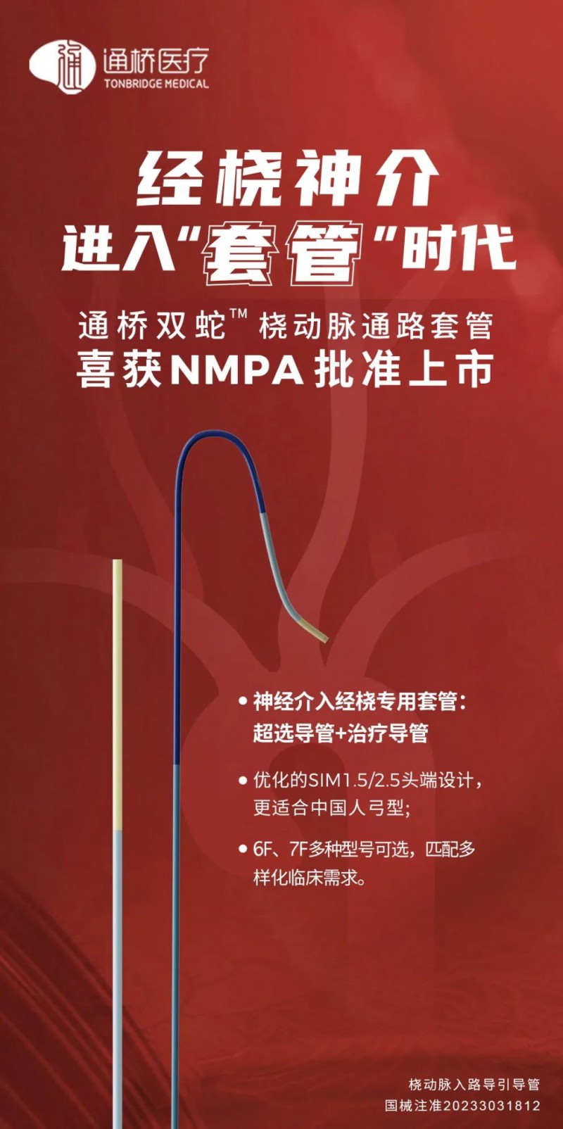 在国内市场,冠脉介入经桡入路的使用比例已超过95%,神经介入经桡入路开展相对较晚,且缺乏专门为经桡入路设计的神经介入通路器械。因此,神经介入经桡入路术式依然存在巨大发展空间。通桥双蛇™桡动脉通路套管的上市,有望为经桡入路神经介入诊疗提供全新的解决方案,带动行业发展。