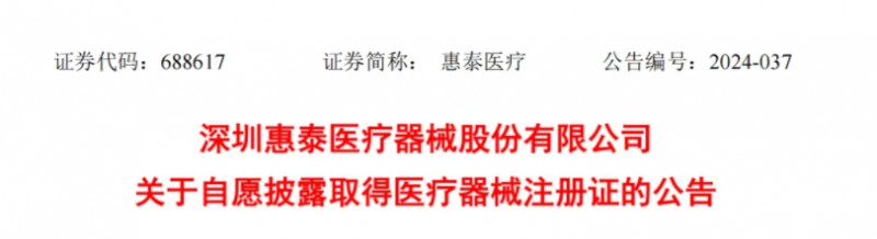 紧接着,2024年8月7日,深圳惠泰医疗器械股份有限公司(简称:惠泰医疗)发表公告,宣布公司获得一项医疗器械注册证。产品名称”一次性使用磁定位环形标测导管“,国械注准20243071412。