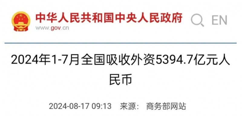 进近来,据商务部数据显示:2024年1-7月,全国新设立外商投资企业31654家,同比增长11.4%;实际使用外资金额5394.7亿元人民币,同比下降29.6%。