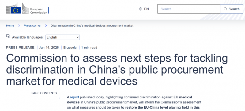 欧盟调查发现中国在竞标公共合同时对欧盟医疗器械生产商存在歧视,在欧盟继续将对话作为寻求解决方案的第一步的同时,欧盟随时准备采取果断行动,捍卫公平竞争环境,支持公平竞争。