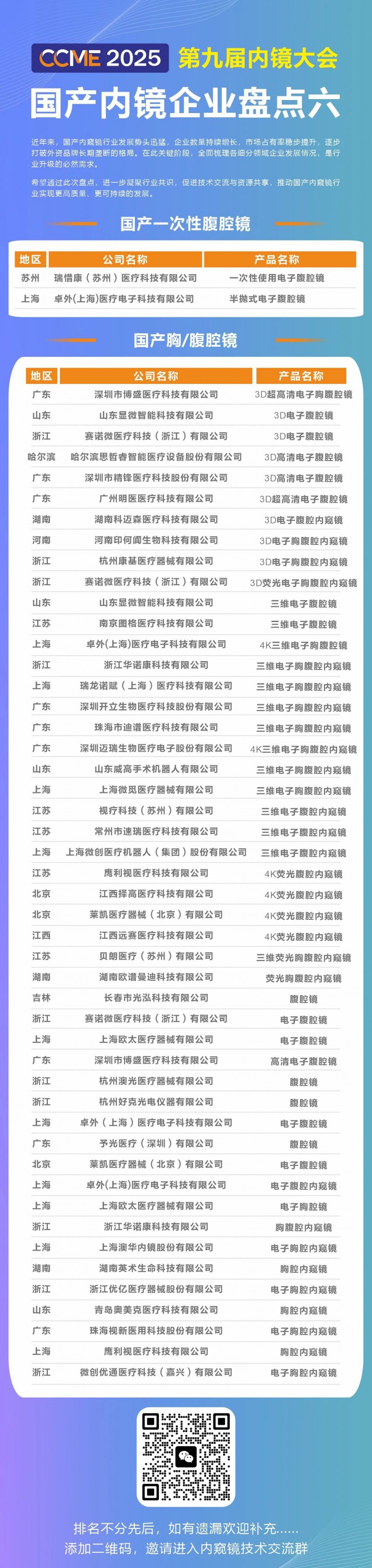 希望通过此次盘点,进一步凝聚行业共识,促进技术交流与资源共享,推动国产内窥镜行业实现更高质量、更可持续的发展。并将于7月24、25日“CCME2025全球医疗器械创新大会暨第九届内镜大会”期间正式发布”国产胸腔镜/腹腔镜TOP10榜单”!