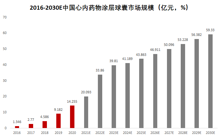 因此,根据弗若斯特沙利文预测数据,国内冠脉药物洗脱球囊市场规模从2016 年的1.35 亿元大幅增长至2021 年的20.09 亿元,预计2025 年市场规模将进一步攀升至43.86 亿元,2030 年预计将达到59.33 亿元。药物洗脱球囊市场规模具体如下: