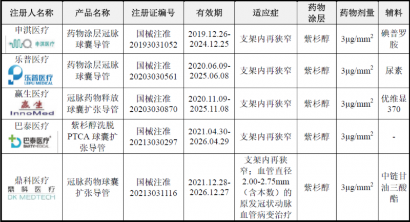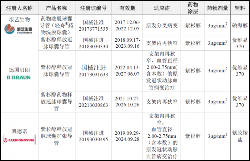 需要特备注意的是,冠脉药物洗脱球囊目前已基本实施带量采购。根据各地已实施的冠脉药物洗脱球囊集中带量采购地区的中标情况,国内市场主要竞争企业为德国贝朗、垠艺生物、申淇医疗、乐普医疗等。冠脉药物洗脱球囊竞品信息对比如下: