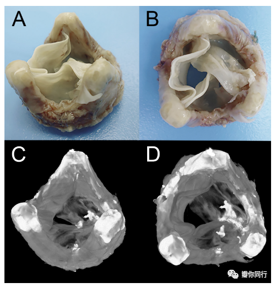 图1移植生物心脏瓣膜有退行性改变(纤维化和钙化迹象) (A) 流出部分(等距图),(B) 流出部分(俯视图),(C)流出侧显微断层投影(等距图),(D)流出侧显微断层投影(俯视图)。