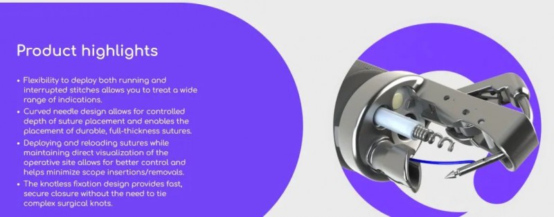 其中,OverStitch™ 支持依赖于上消化道和下消化道软组织的闭合、贴合或止血的程序。缝合手术包括传统的胃肠道应用,如瘘管闭合、内窥镜粘膜下夹层 (ESD)、内窥镜粘膜切除术 (EMR) 、经口内窥镜肌切开术 (POEM) 手术。该产品可以促进新的和新兴的内窥镜应用,保持手术部位直接可视化。