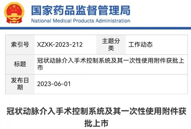 6月1日,西门子的血管介入机器人CorPath GRX获NMPA批准上市,该产品是国内第二款批准上市的血管介入机器人,预期用途为“冠状动脉介入手术控制系统和一次性使用冠状动脉介入手术控制系统附件配套使用,辅助临床医生在经皮冠状动脉介入手术期间,输送和操作导丝、导引导管或者快速交换球囊扩张导管/支架。”