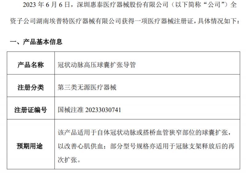 2023年6月6日,惠泰医疗全资子公司湖南埃普特医疗器械有限公司获得一项医疗器械注册证,产品名称“冠状动脉高压球囊扩张导管”。该产品是第三类无源医疗器械。