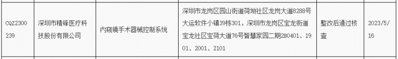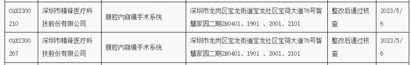 6月12日,广东省药监局正式公布《2023年5月医疗器械注册质量管理体系核查结果》。经过一个月整改,精锋医疗采撷“好果”。结果显示,精锋医疗旗下两款腹腔内窥镜手术系统和内窥镜手术器械控制系统通过广东省药监局的严格核查。