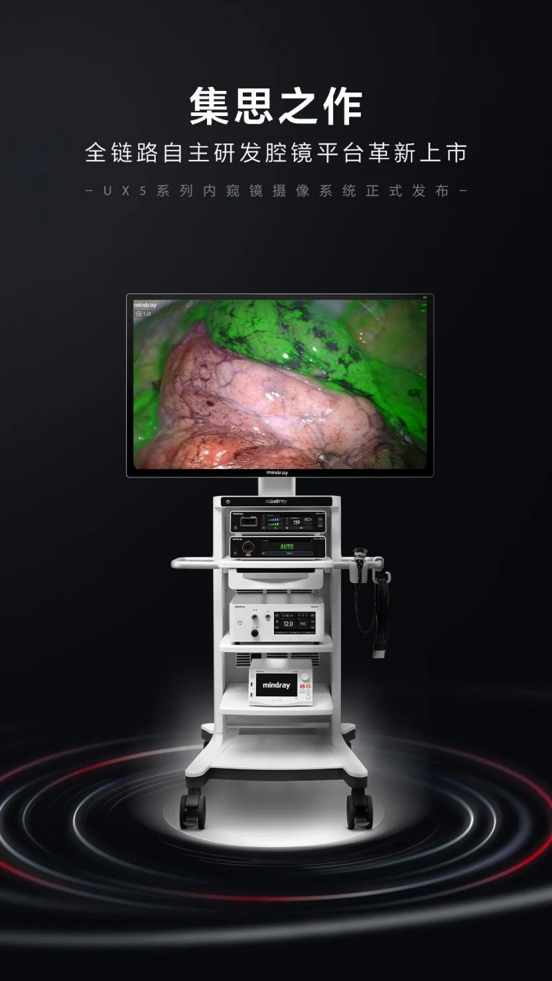 今年7月底,迈瑞发布了新一代可拓展腔镜平台UX5。UX5凭借光源、光学镜、摄像头、图像算法等全链路自主研发,将软件算法与硬件性能融会贯通,带来影像性能的跃升;荧光关键技术的突破,使得隐匿病灶和染色边界真实显影,从而精准导航。同时,UX5新增拓展接口,实现超声与腔镜的同屏显示,解决了传统腔镜+超声手术中,需要医生来回查看两种影像的痛点。