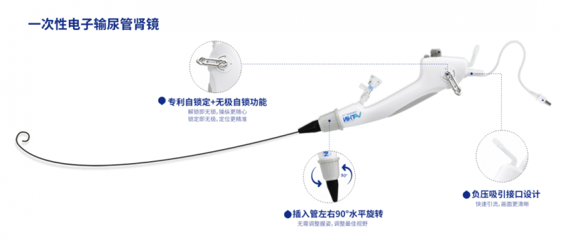 华芯医疗一次性电子输尿管肾镜,拥有独家专利——铆接蛇骨设计,性能可媲美复用镜的整体操控性。头端可上下285°超广角弯曲,全肾腔道皆可达,可引导可弯头部负压鞘抵达肾下盏,是医护人员诊疗的最佳搭档。专利自锁定+无级自锁功能,解锁即无锁,操纵更随心,锁定即无极,定位更精准。插入管可左右90°水平旋转,无需改变握姿,即可调至最佳视野。
