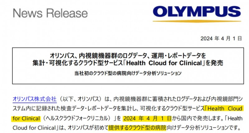 同时,奥林巴斯还宣布推出名为Health Cloud的基于云的服务。该服务可以聚合并可视化内窥镜设备中的日志数据,以及内窥镜科室系统记录的测试、报告数据。Health Cloud将于 2024年4月1日起在日本推广,这是奥林巴斯首个针对医院的、基于云的数据分析解决方案。