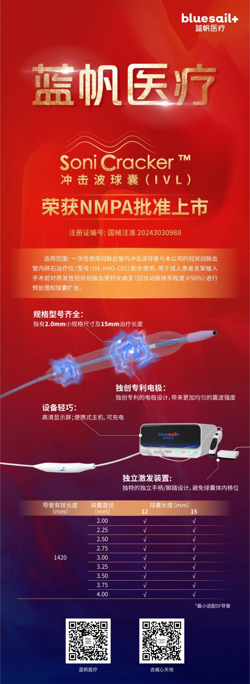 近日,蓝帆医疗心脑血管事业部子公司上海蓝帆博元医疗科技有限公司自主研发的一次性使用冠脉血管内冲击波导管——Soni Cracker™-CL(国械注准20243030988)经过中国国家药品监督管理局(NMPA)的审查批准,正式获得NMPA医疗器械注册证。
