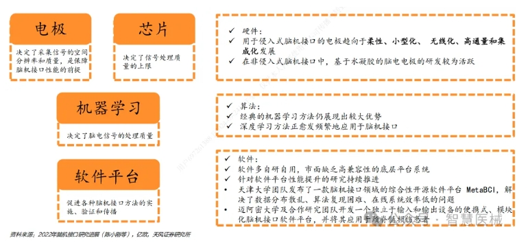 脑机接口技术主要涉及硬件、软件和算法。其中,硬件主要包括用于脑电信号采集或神经刺激的电极、用于信号采集处理的芯片以及外部设备;算法主要是用于信号处理的机器学习,软件主要涉及刺激呈现、数据采集、信号处理与输出、系统级操作协议等多个关键技术环节。