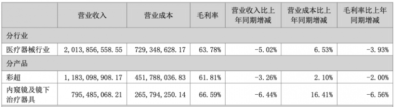 从开立医疗2024年业务划分来看,其彩超业务营收同比下降3.26%,毛利率同比下降2%;而内窥镜及镜下治疗器具业务营收同比下降6.44%,毛利率同比下降6.56%,公司综合毛利率同比下降3.93%。