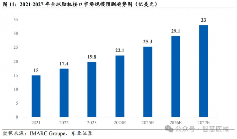 市场规模方面,据国际市场研究机构IMARC Groupe的数据显示,2021年,全球脑机接口市场规模达15亿美元,2022年市场规模增至17.4亿美元,预计2027年全球脑机接口市场规模将达到33亿美元。