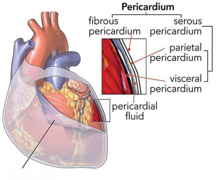 心包膜(pericardium)是人体心脏表面包裹心和出入心大血管根部的纤维浆膜囊,分内、外两层,外层为纤维性心包,内层为浆膜性心包。其中,纤维性心包由坚韧的结缔组织构成,防止心过度扩张,保持血容量的相对恒定,并起到屏障保护作用;浆膜性心包薄而光滑,分脏、壁两层,脏层即心外膜,紧贴心肌层表面及出入心的大血管根部外面。